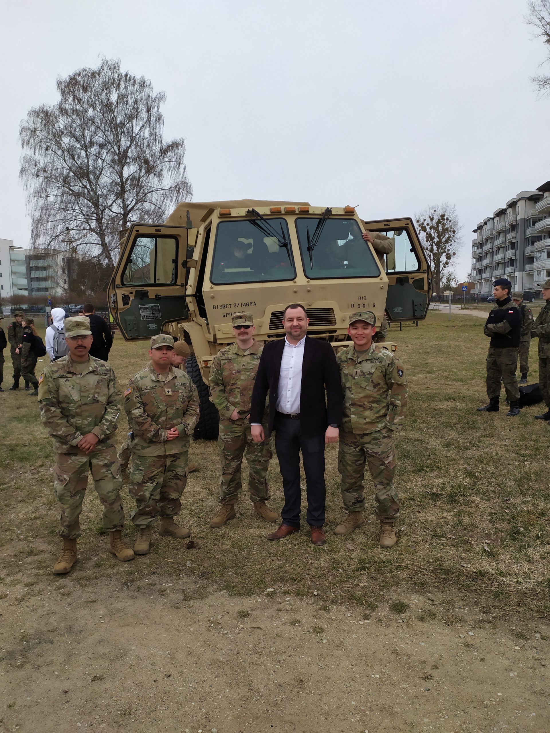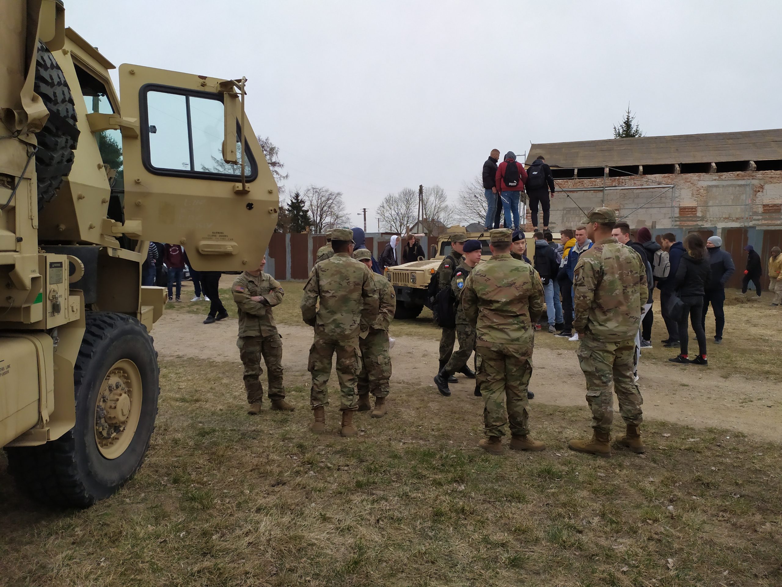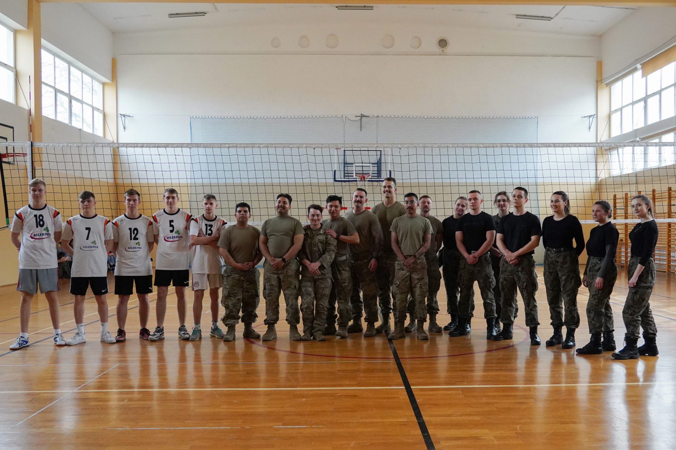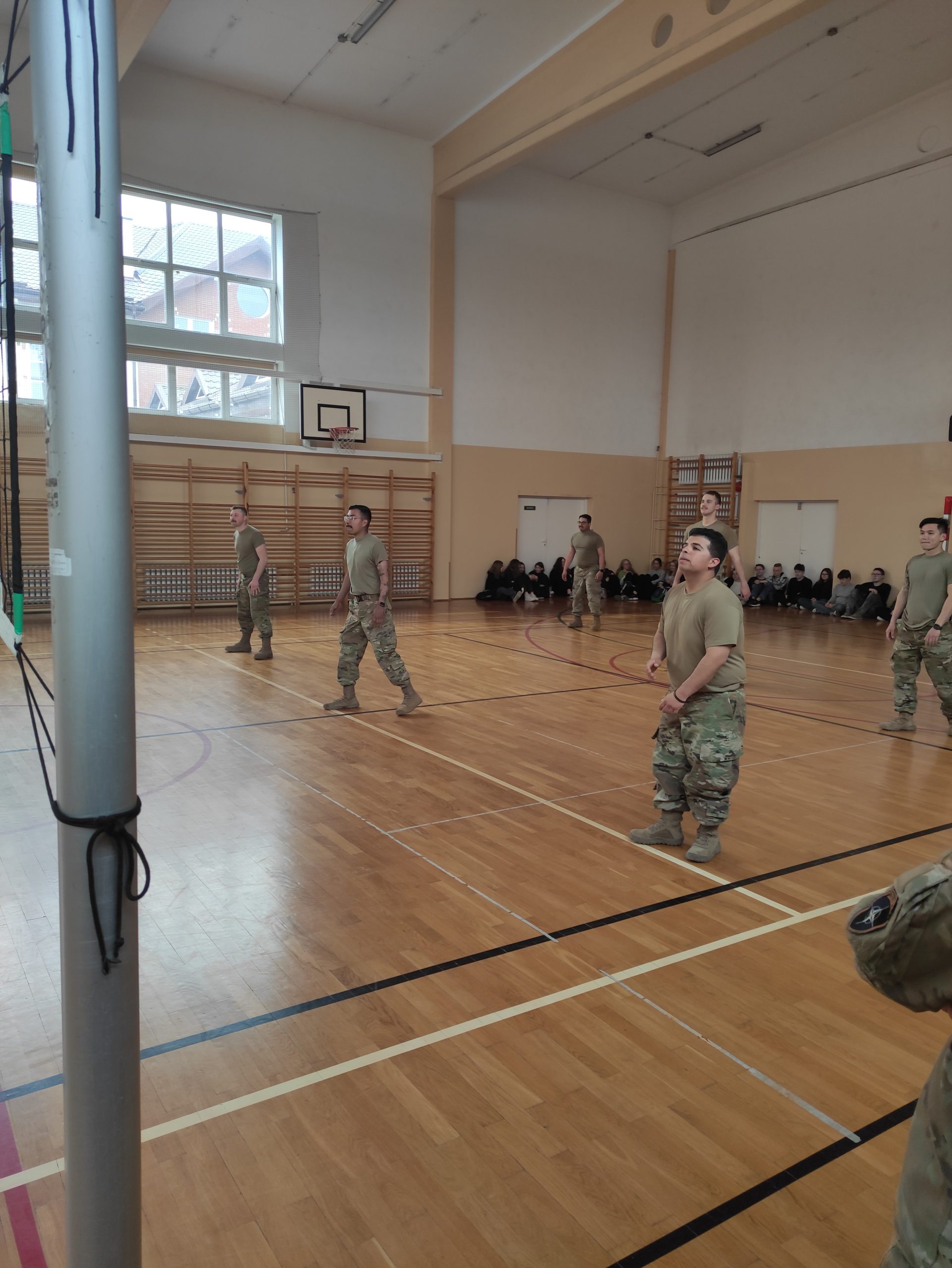 01.04.2022r. w ramach dobrej współpracy odwiedziło nas kilku żołnierzy z kompanii alpha stacjonującej w Bemowie Piskim. Grupa żołnierzy pod komendą kapitana Jeffreya Hansona zaprezentowała swoje wozy bojowe. Uczniowie mieli okazję porozmawiać o służbie w wojsku w USA, „podszlifować” j. angielski w rozmowach oraz zrobić sobie wspólne zdjęcie. Zwieńczeniem spotkania były dwa pokazowe mecze piłki siatkowej.