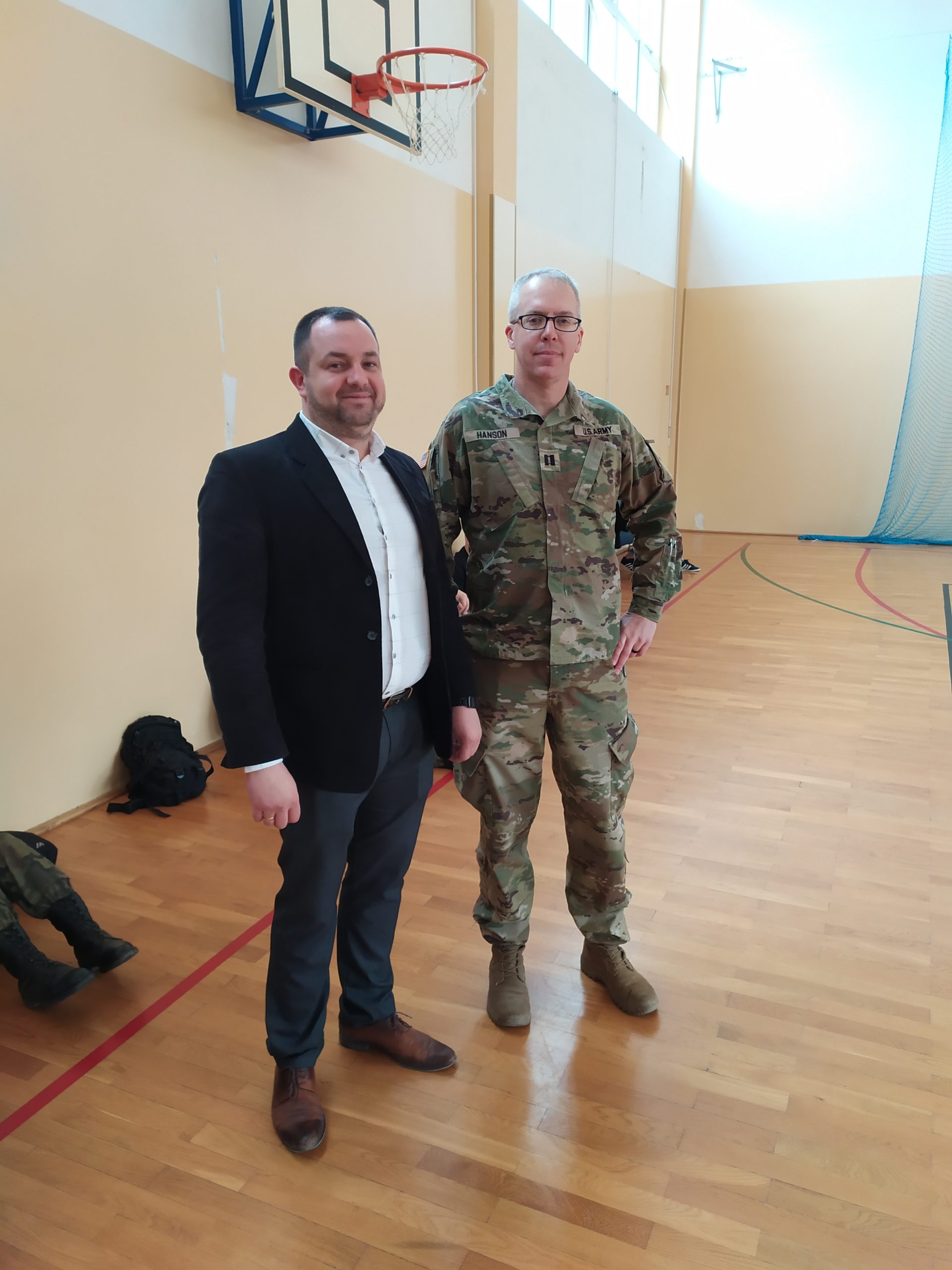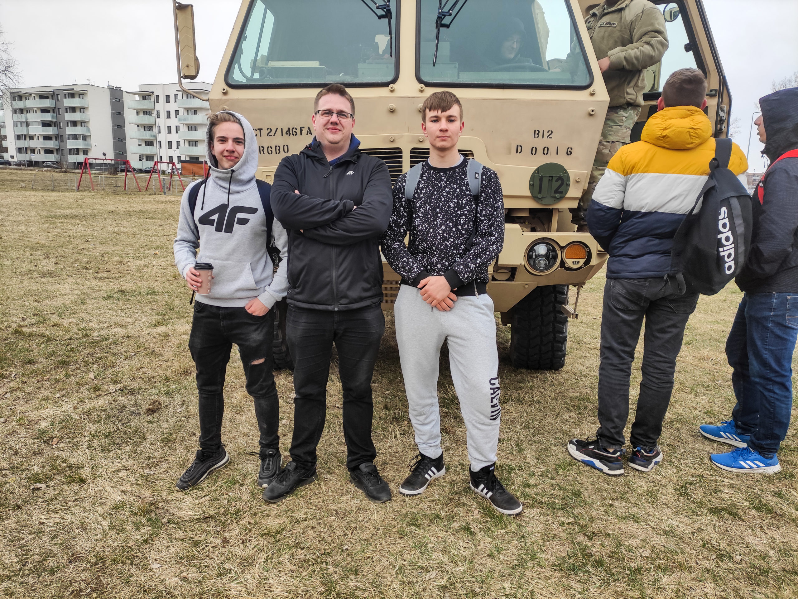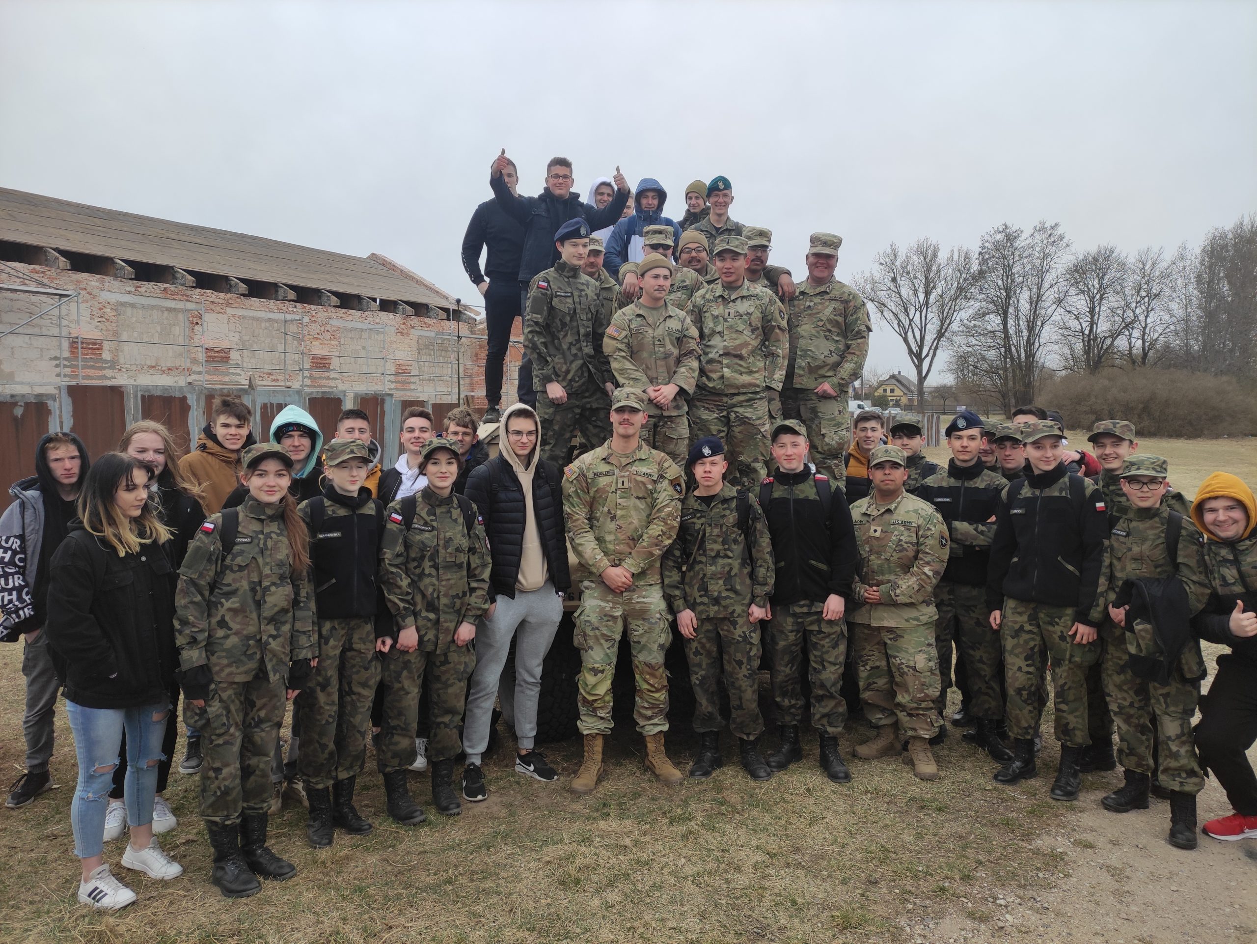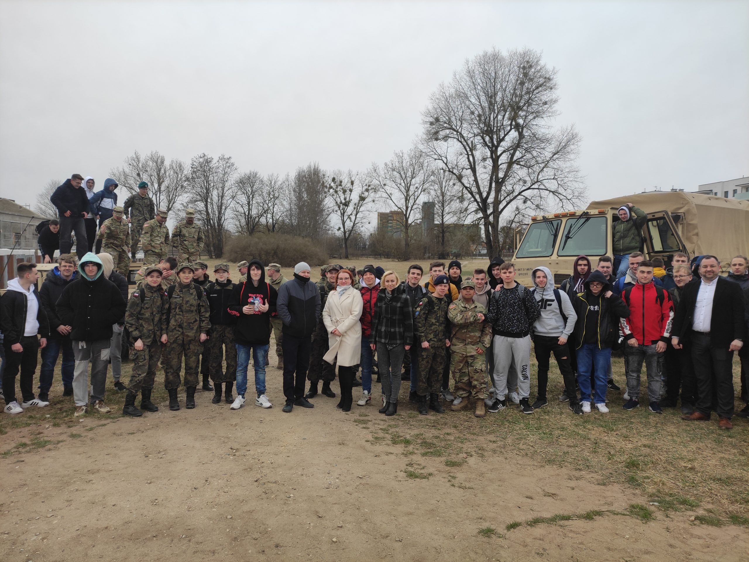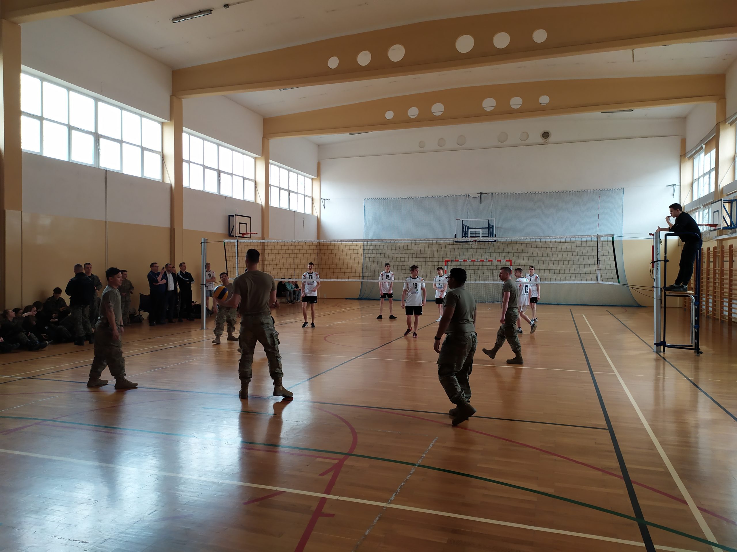 01.04.2022r. w ramach dobrej współpracy odwiedziło nas kilku żołnierzy z kompanii alpha stacjonującej w Bemowie Piskim. Grupa żołnierzy pod komendą kapitana Jeffreya Hansona zaprezentowała swoje wozy bojowe. Uczniowie mieli okazję porozmawiać o służbie w wojsku w USA, „podszlifować” j. angielski w rozmowach oraz zrobić sobie wspólne zdjęcie. Zwieńczeniem spotkania były dwa pokazowe mecze piłki siatkowej.
