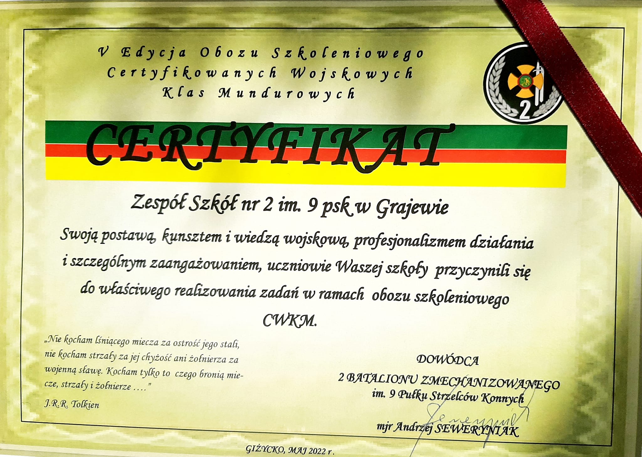 Klasa 3w sp z II LO w Grajewie w dn. 23.05.2022r. – 27.05.22r. odbyła obóz w ramach edukacji certyfikowanej wojskowej klasy mundurowej. Szkolenie odbyło się pod wodzą 15. Giżyckiej Brygady Zmechanizowanej im. Zawiszy Czarnego. Opiekunami na obozie byli nauczyciele: Pani mgr Beata Strzałkowska oraz Pan mgr Ryszard Borkowski.