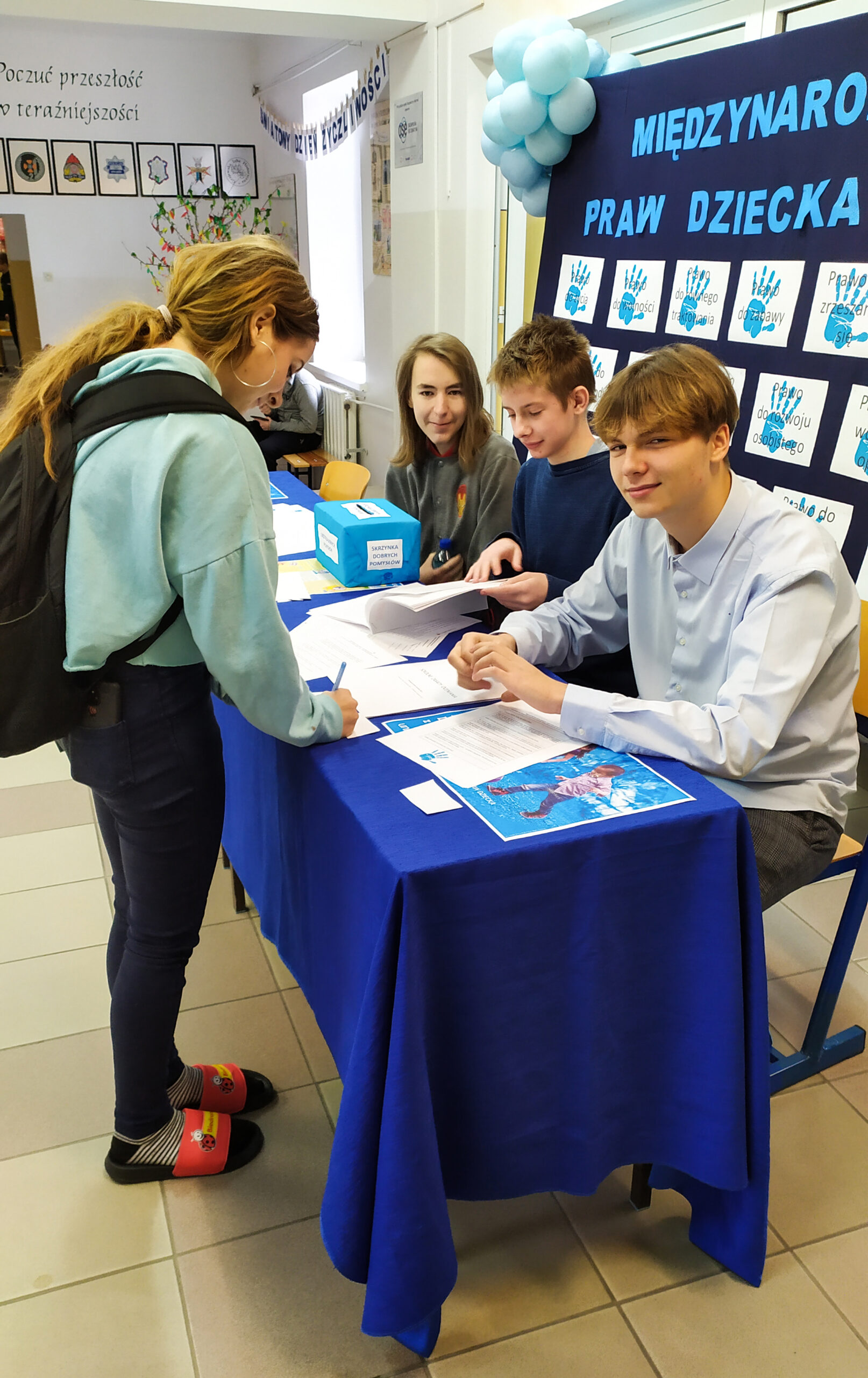 Celem akcji było upowszechnienie wiedzy o prawach dziecka. W ramach solidarności ze wszystkimi dziećmi na świecie, a przede wszystkim z dziećmi, których prawa nie są przestrzegane -społeczność szkolna założyła tego dnia ubrania w kolorze niebieskim. Nasi uczniowie mieli okazję zapoznać się z prawami dziecka oraz z prawami człowieka. Ponadto pedagog szkolny oraz rzecznik praw ucznia przeprowadzili zajęcia przybliżające uczniom Konwencję o prawach dziecka oraz poruszające kwestie przeciwdziałania dyskryminacji.