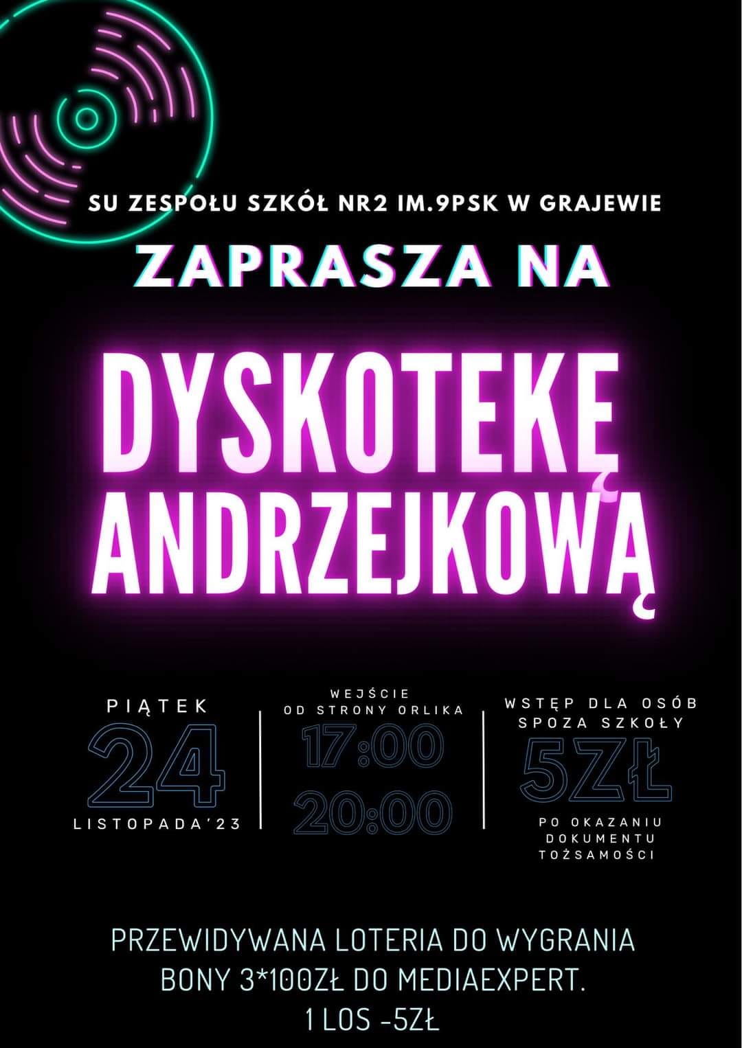 Plakat informujący o dyskotece wykonała uczennica klasy 2w, Gabriela Zuzanna Komor.