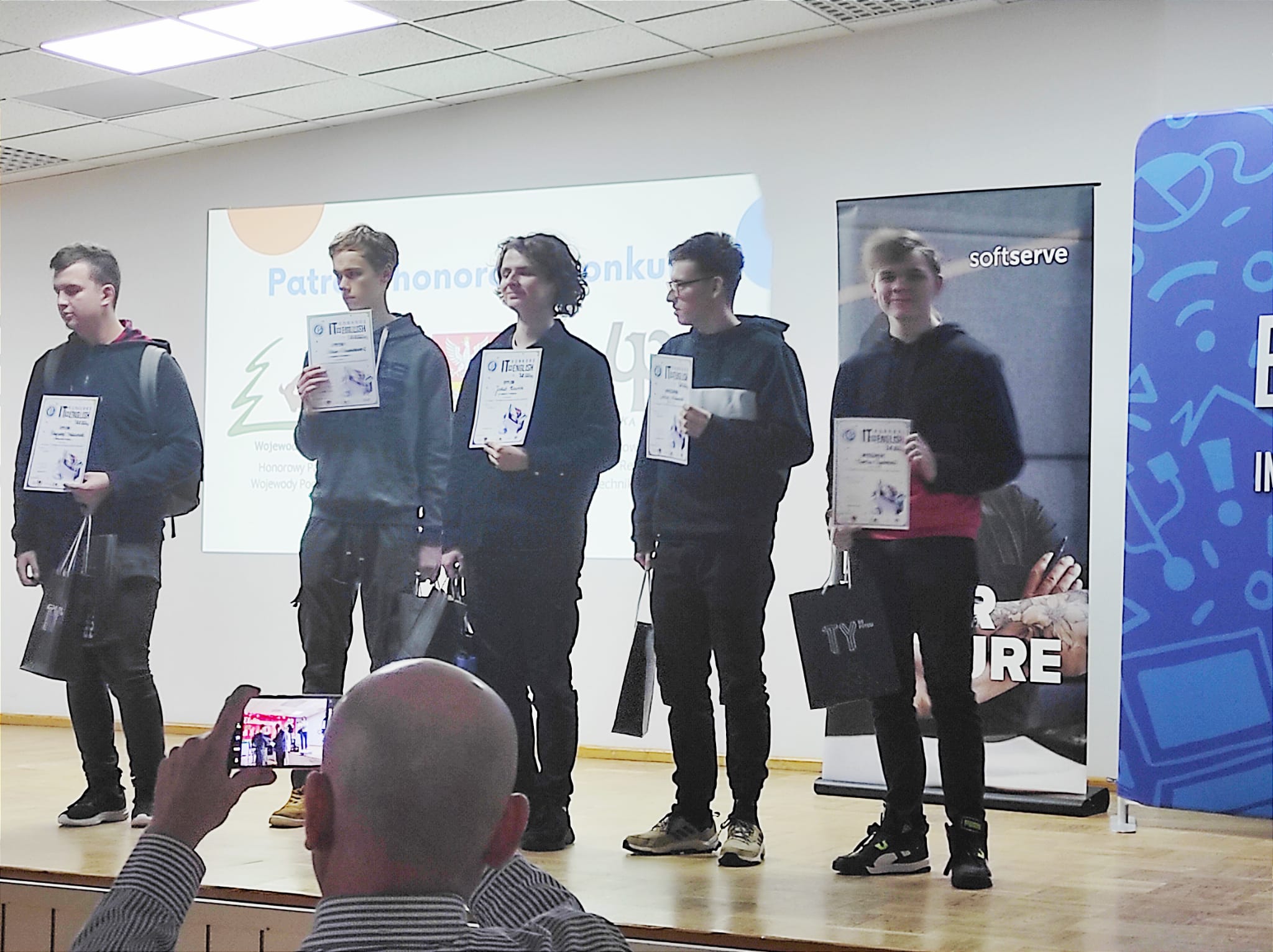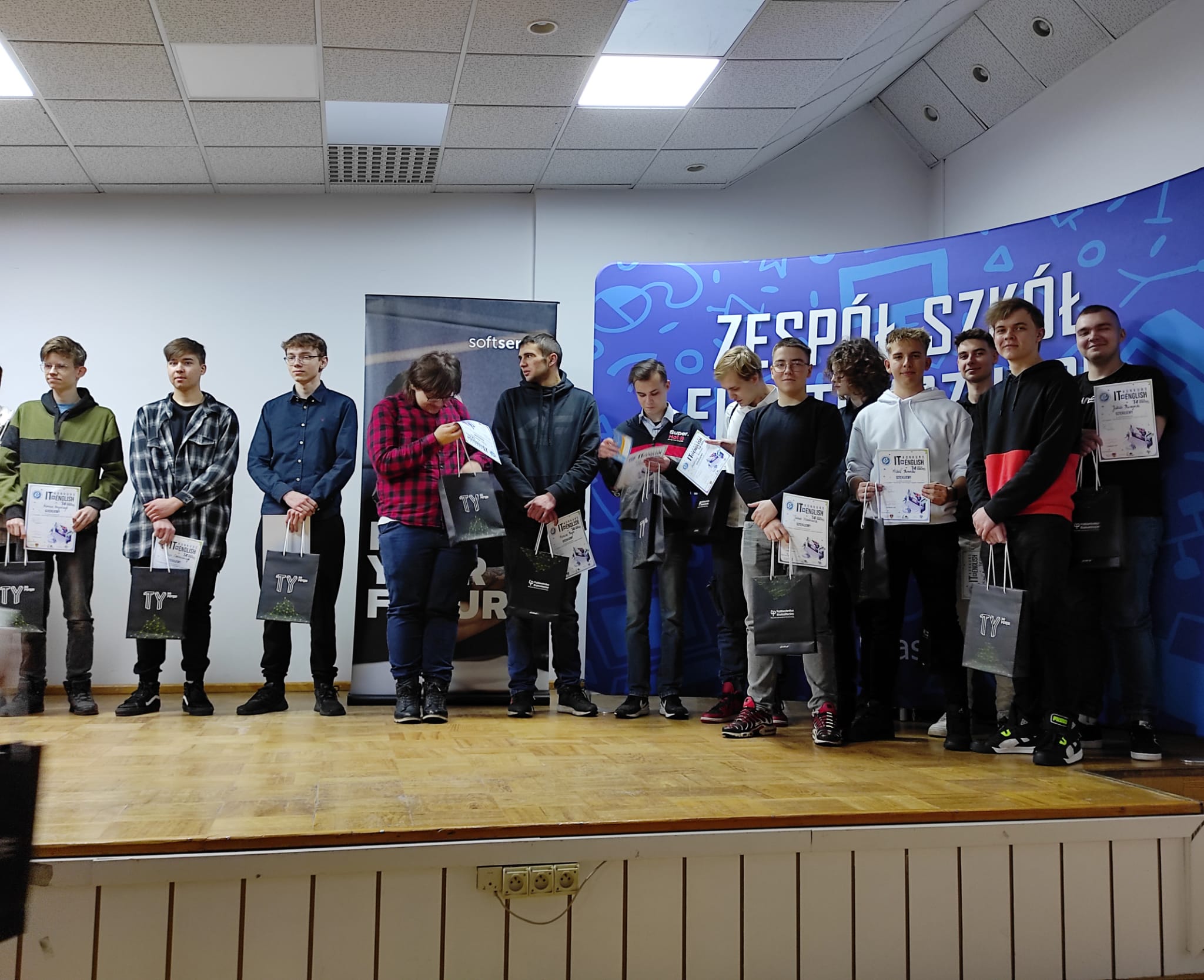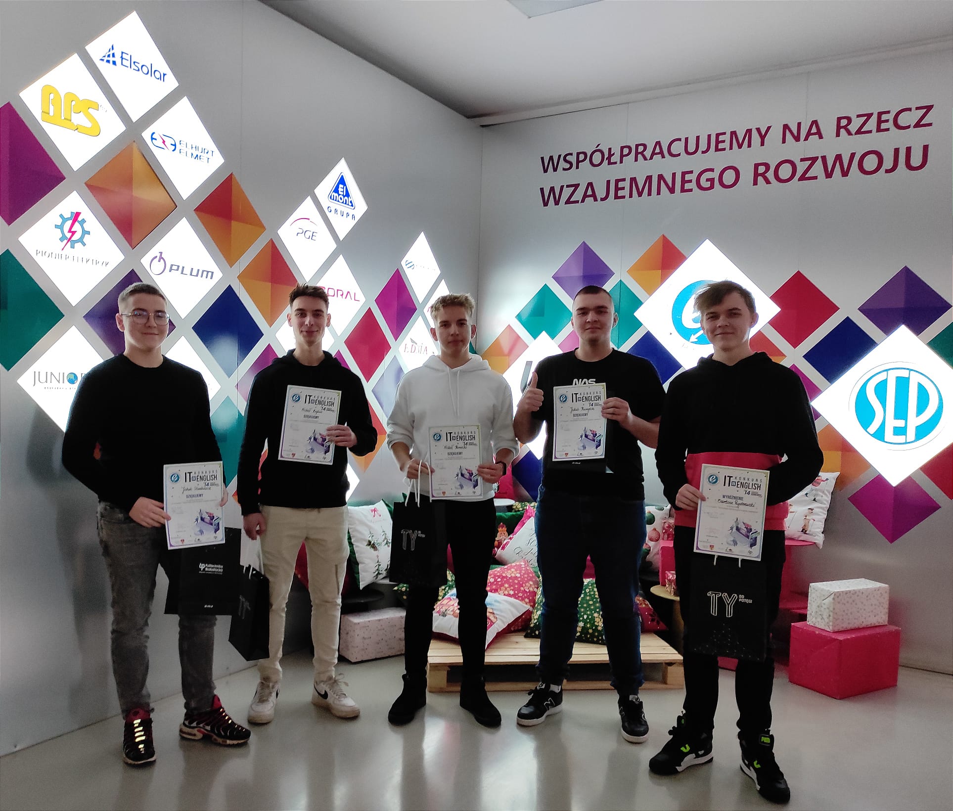 Dnia 28 listopada 2023 r. uczniowie: Rydzewski Bartosz, Bylica Michał, Stankiewicz Jakub, Koniecko Michał oraz Kuczyński Jakub uczestniczyli w XIV edycja Międzyszkolnego Konkursu z języka angielskiego dla techników – „IT in ENGLISH – Technologia informacyjna w języku angielskim”, organizowanego pod honorowymi patronatami: Wojewody Podlaskiego, Prezydenta Miasta Białegostoku oraz Rektora Politechniki Białostockiej.