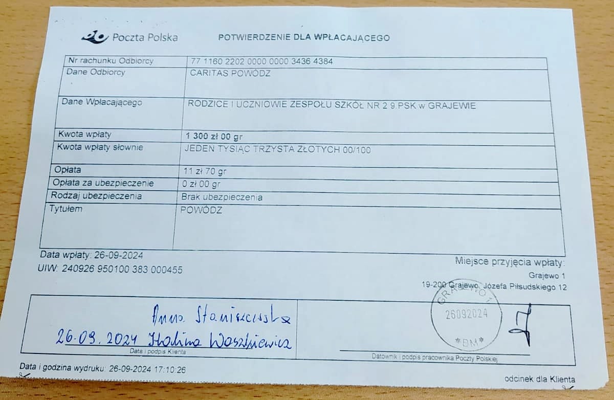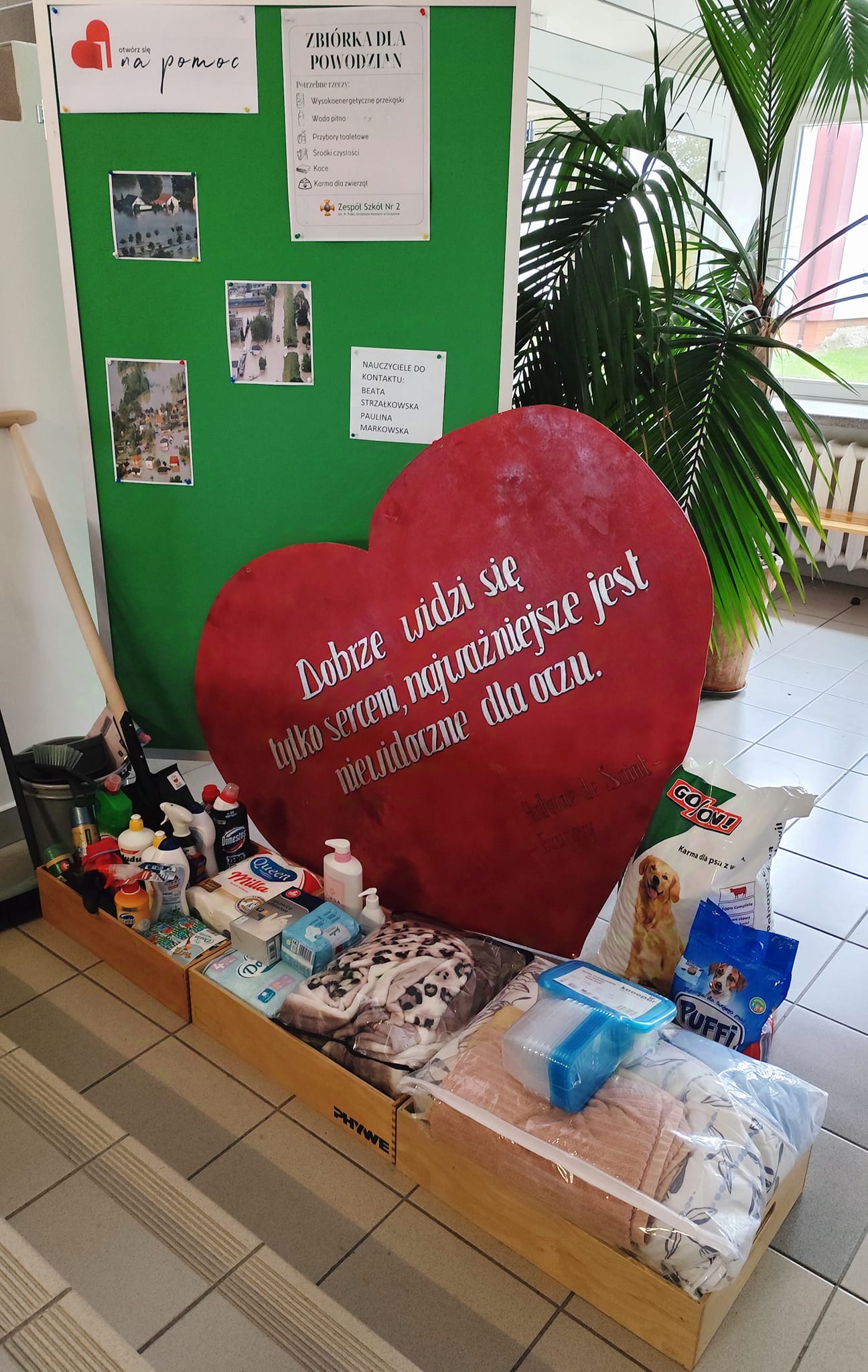 Jeszcze raz dziękujemy i zachęcamy Państwa do wzięcia udziału w zbiórce dla powodzian. Stanowisko, gdzie można zostawiać rzeczy znajduje się w holu przy głównym wejściu do szkoły.