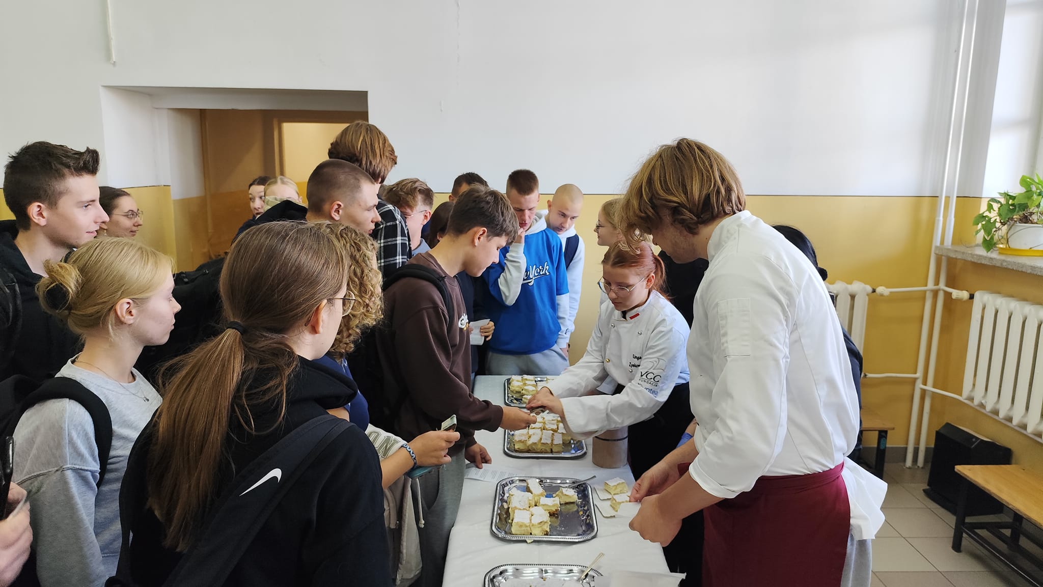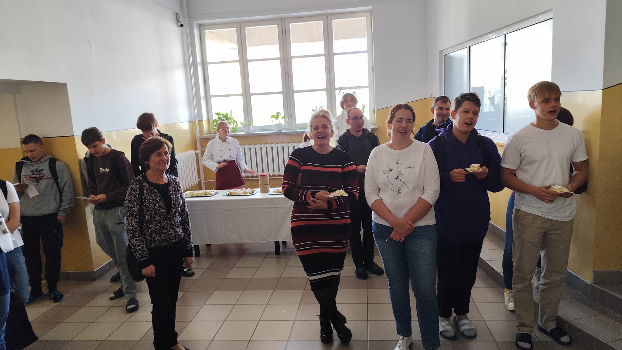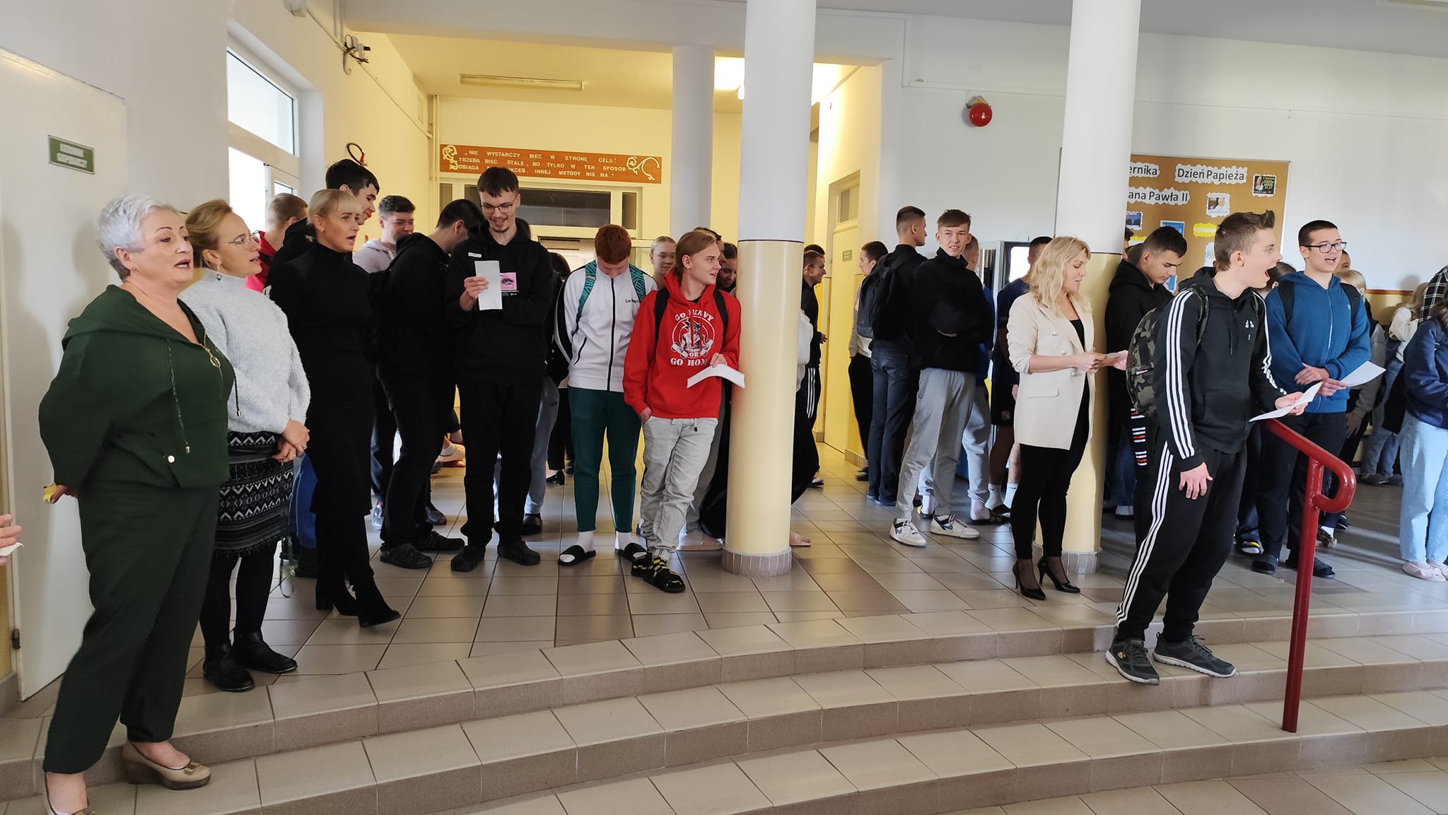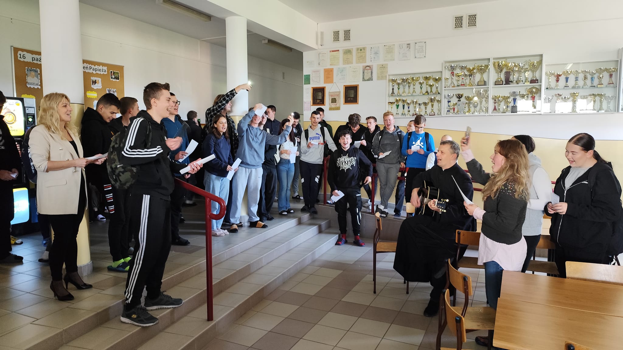Z okazji Dnia Papieskiego – 16.10.2024 r. – na długiej przerwie społeczność szkolna zebrała się w holu i wspólne odśpiewała Barkę. Była również możliwość nabycia kremówek papieskich przygotowanych przez klasy gastronomiczne.