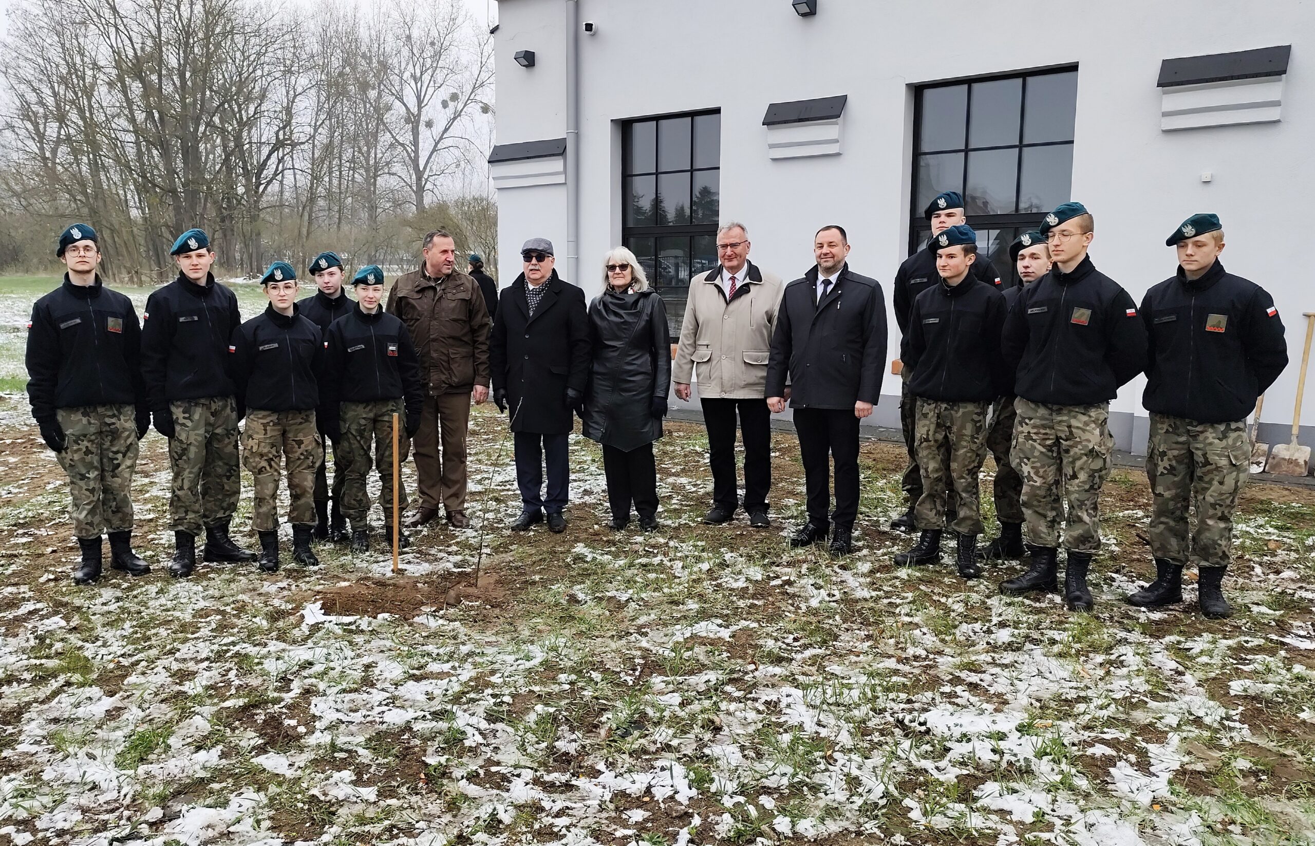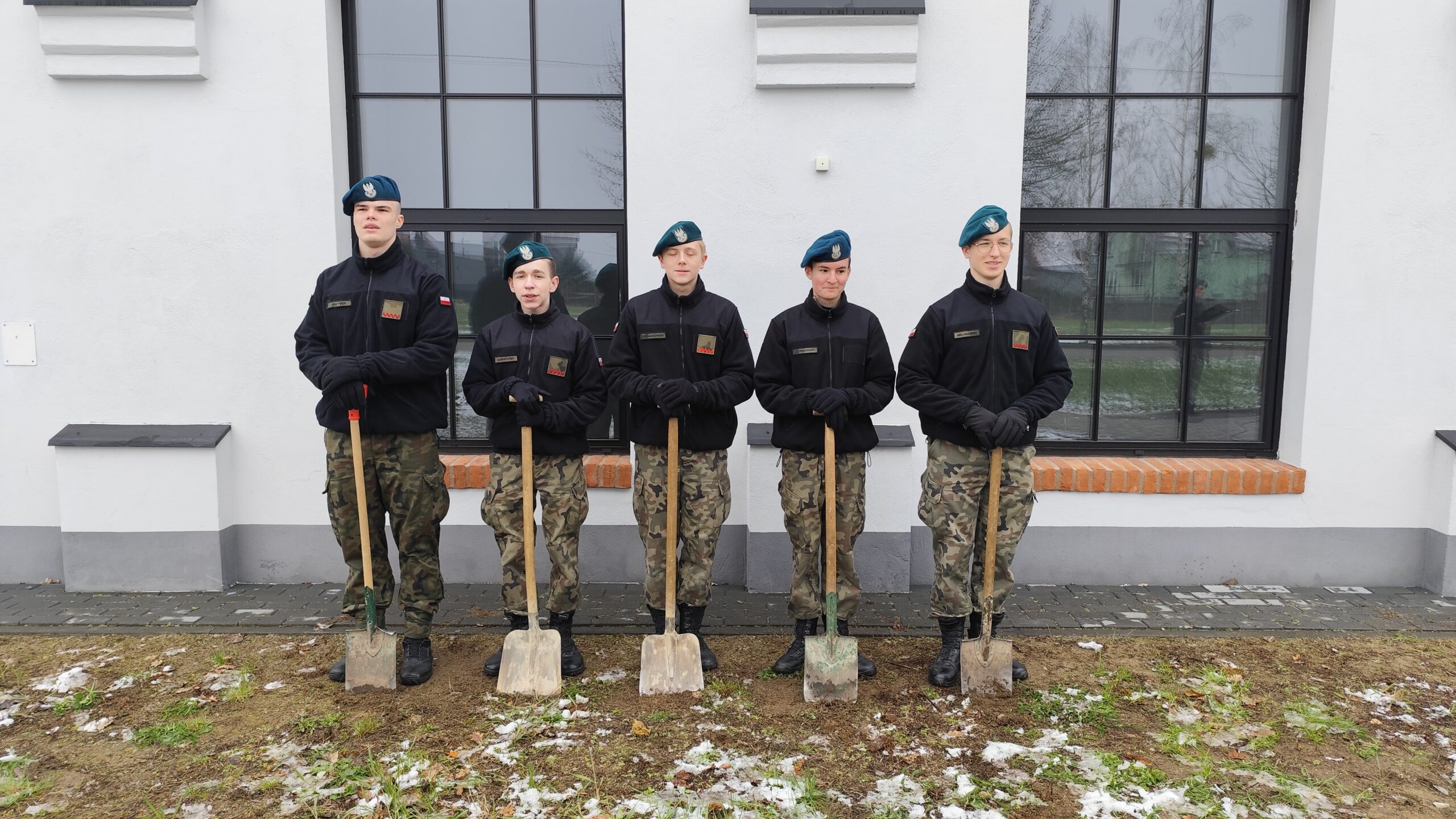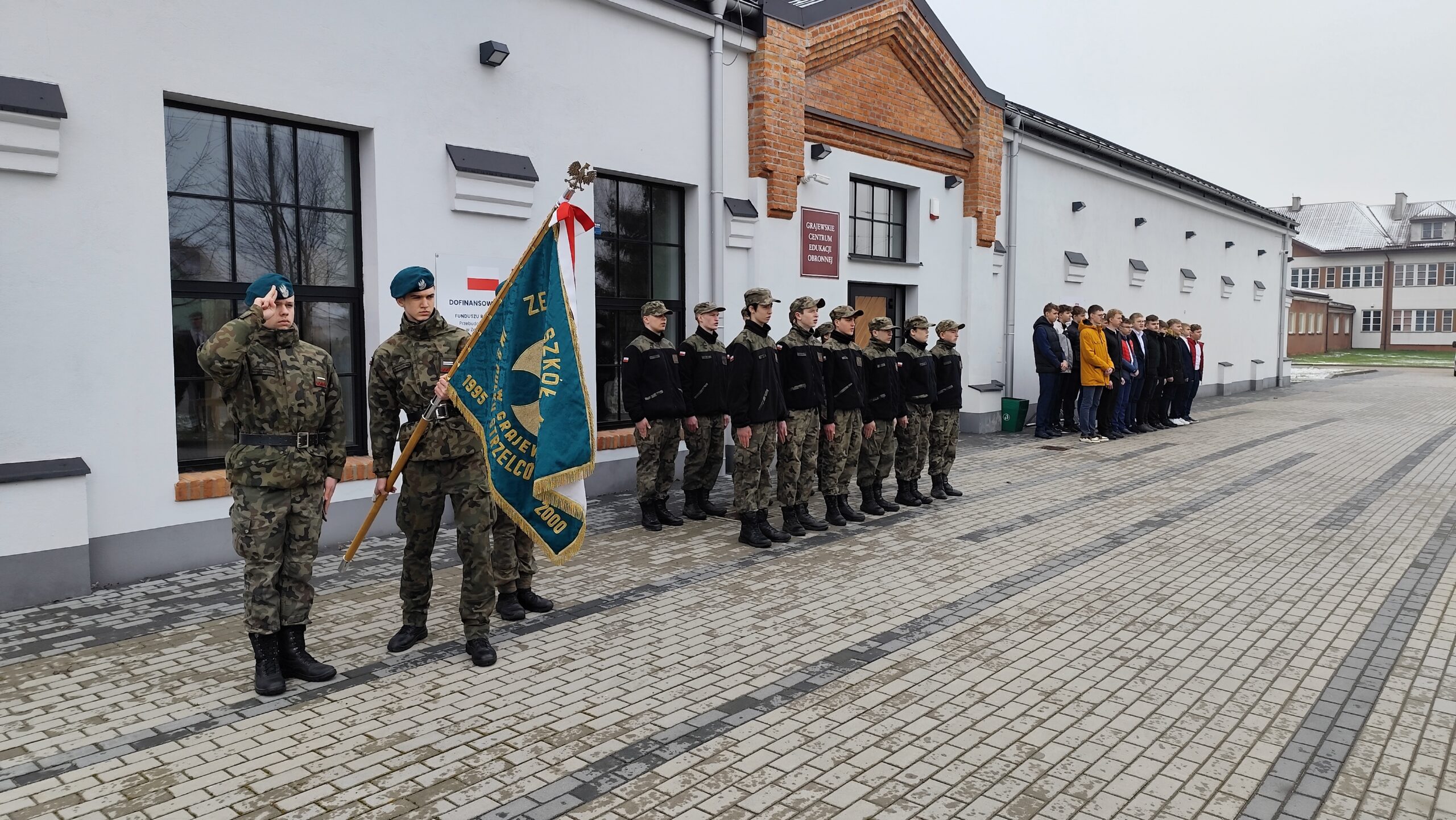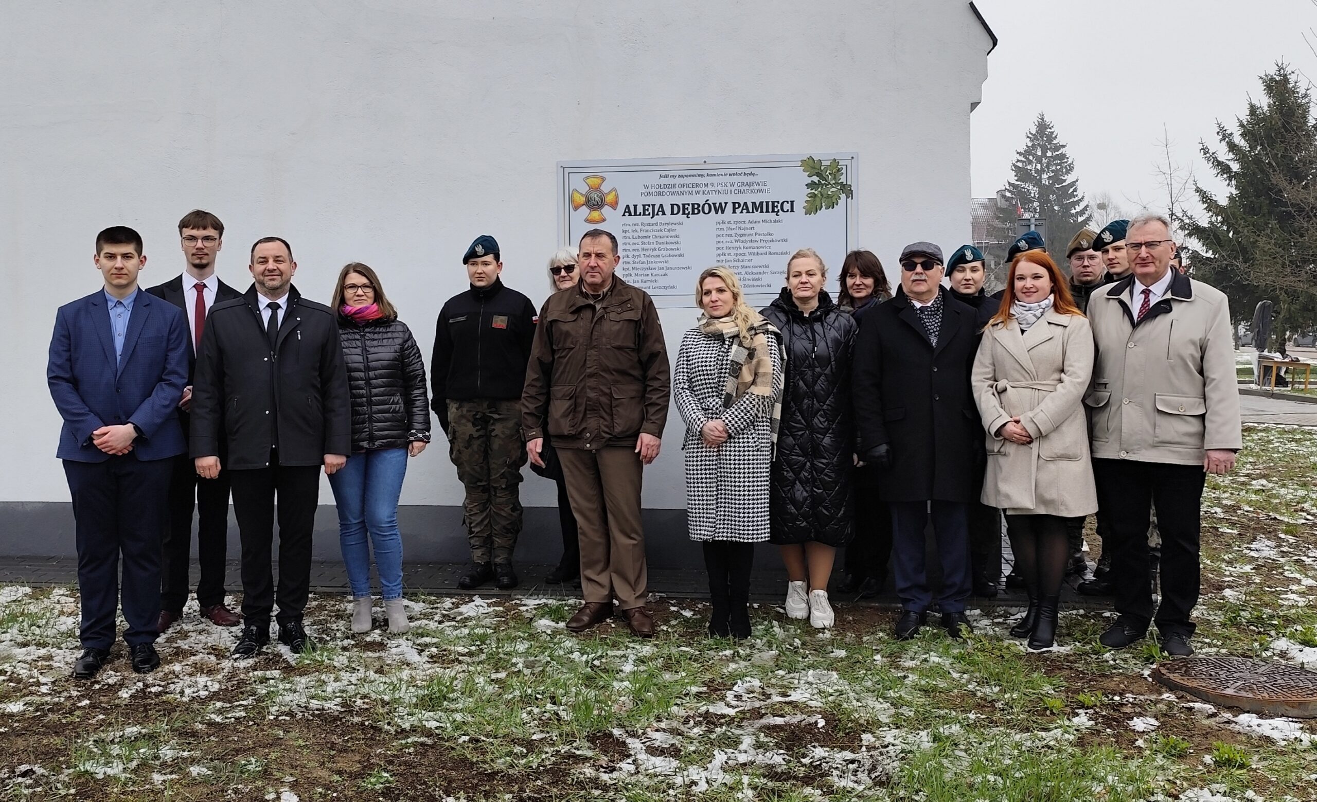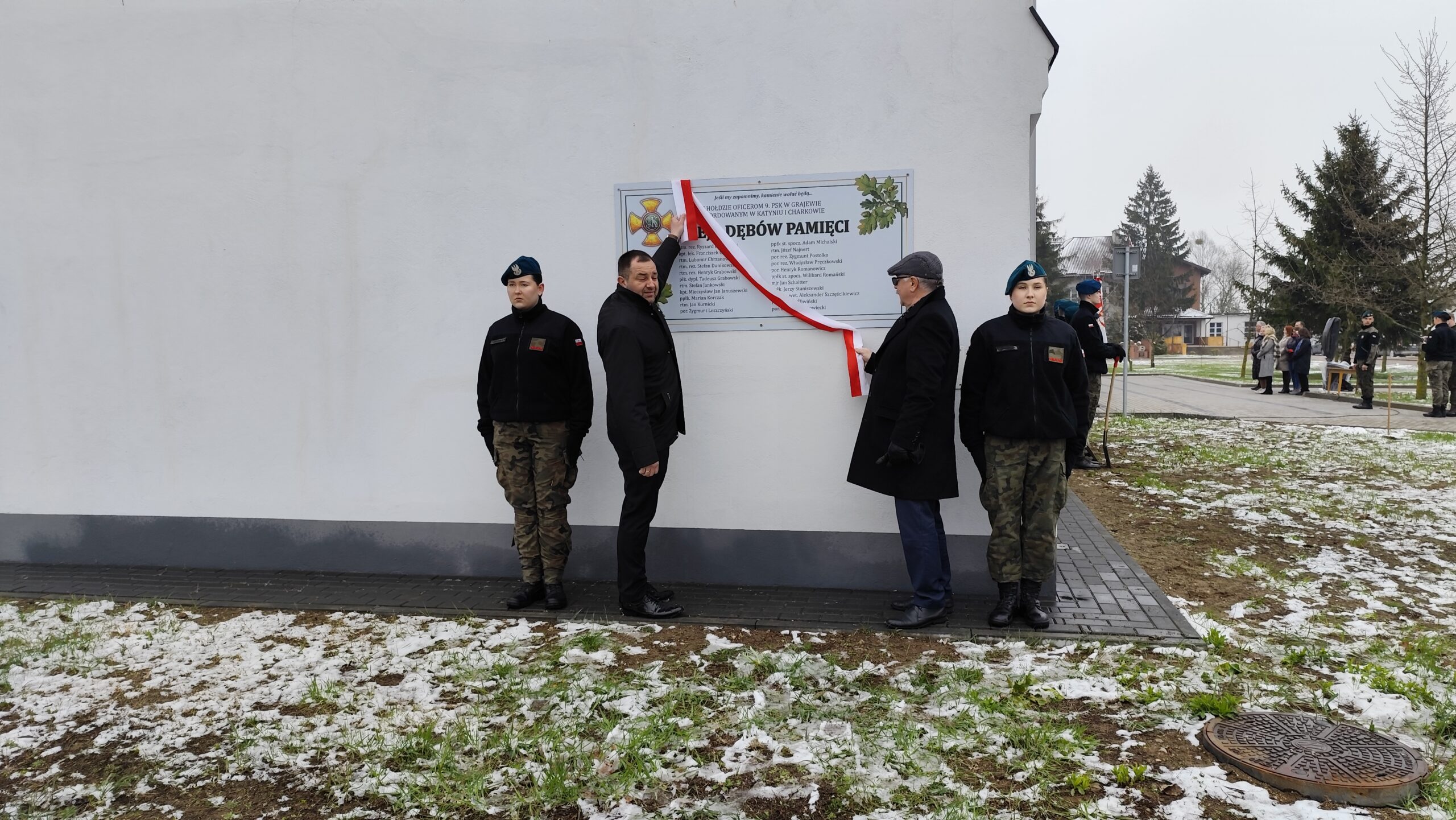 Dnia 11 kwietnia 2025 r. na terenie szkoły w uroczystym apelu upamiętniliśmy tragiczny los od strzału w tył głowy Żołnierzy 9. Pułku Strzelców Konnych. Na budynku Grajewskiego Centrum Edukacji Obronnej została odsłonięta Tablica Pamięci z nazwiskami pomordowanych żołnierzy 9. PSK, a przed budynkiem posadziliśmy szczególne drzewka pamięci – dęby, jako symbol długowieczności i twardości Naszej pamięci o tych, których tradycje i dobre imię kontynuujemy.