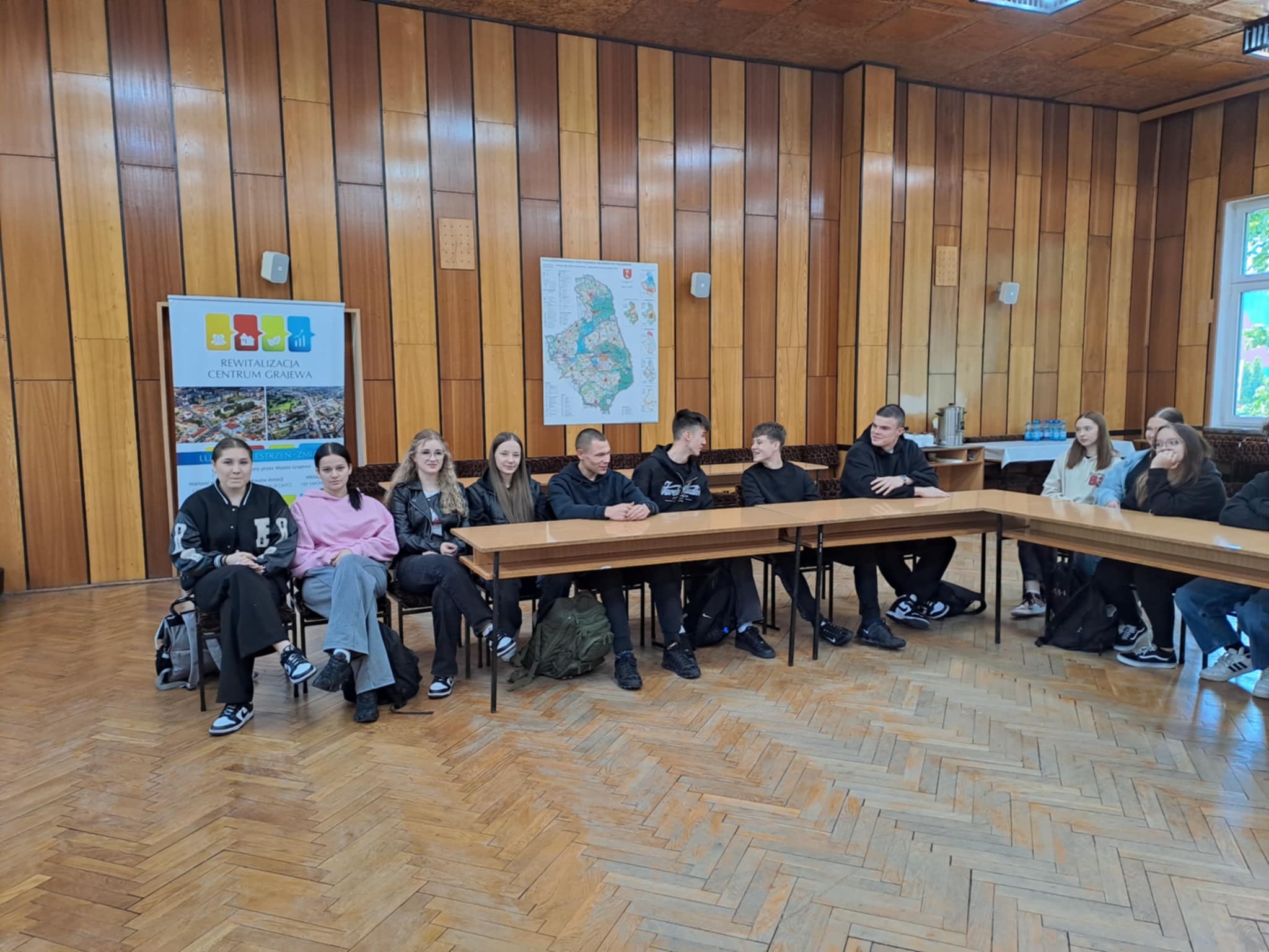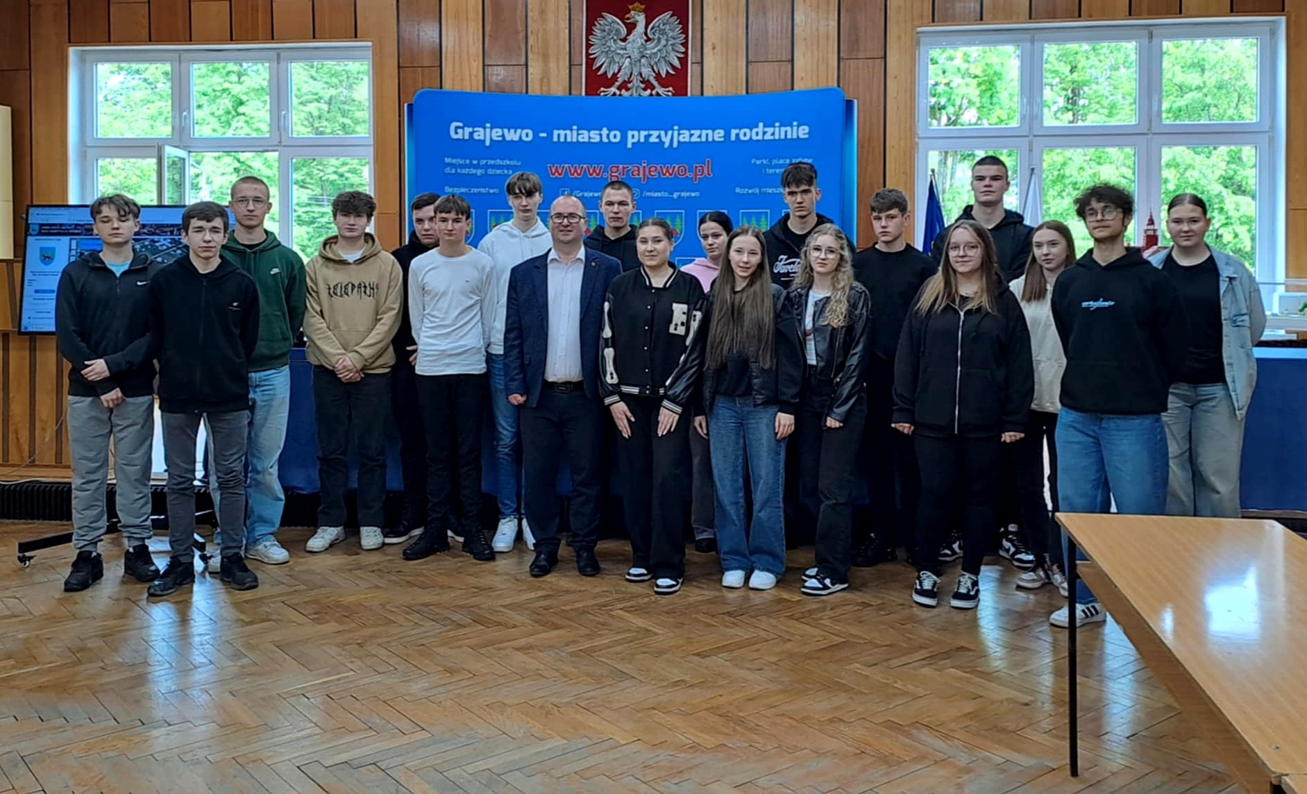 Dnia 19 maja 2025 roku uczniowie klasy 2w LO mieli okazję odwiedzić Urząd Miasta Grajewo w ramach żywej lekcji wiedzy o społeczeństwie. W trakcie wizyty uczniowie spotkali się z Burmistrzem Maciejem Bednarko, który opowiedział o funkcjonowaniu Urzędu Miasta, roli jaką pełni burmistrz oraz Rada Miasta.