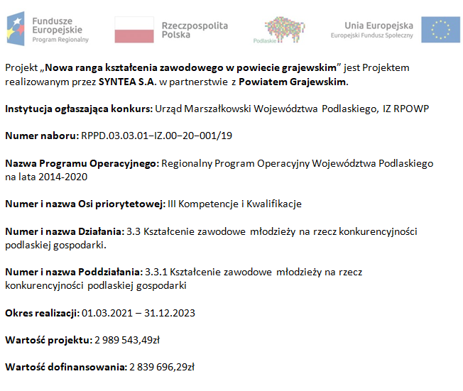 Dzięki oszczędnościom w Projekcie pn. „Nowa ranga kształcenia zawodowego w powiecie grajewskim” Projektem realizowanym przez SYNTEA S.A. w partnerstwie z Powiatem Grajewskim.