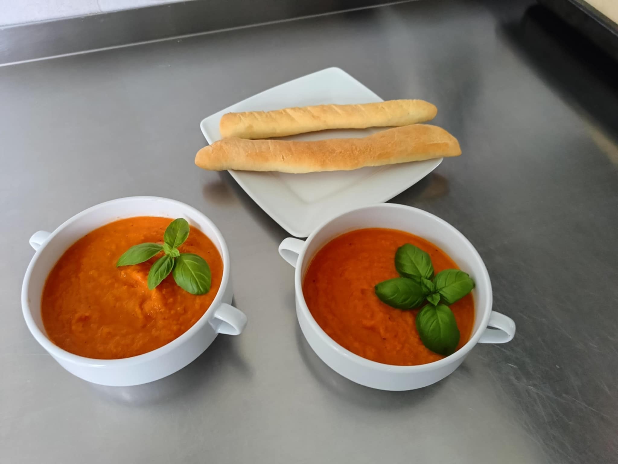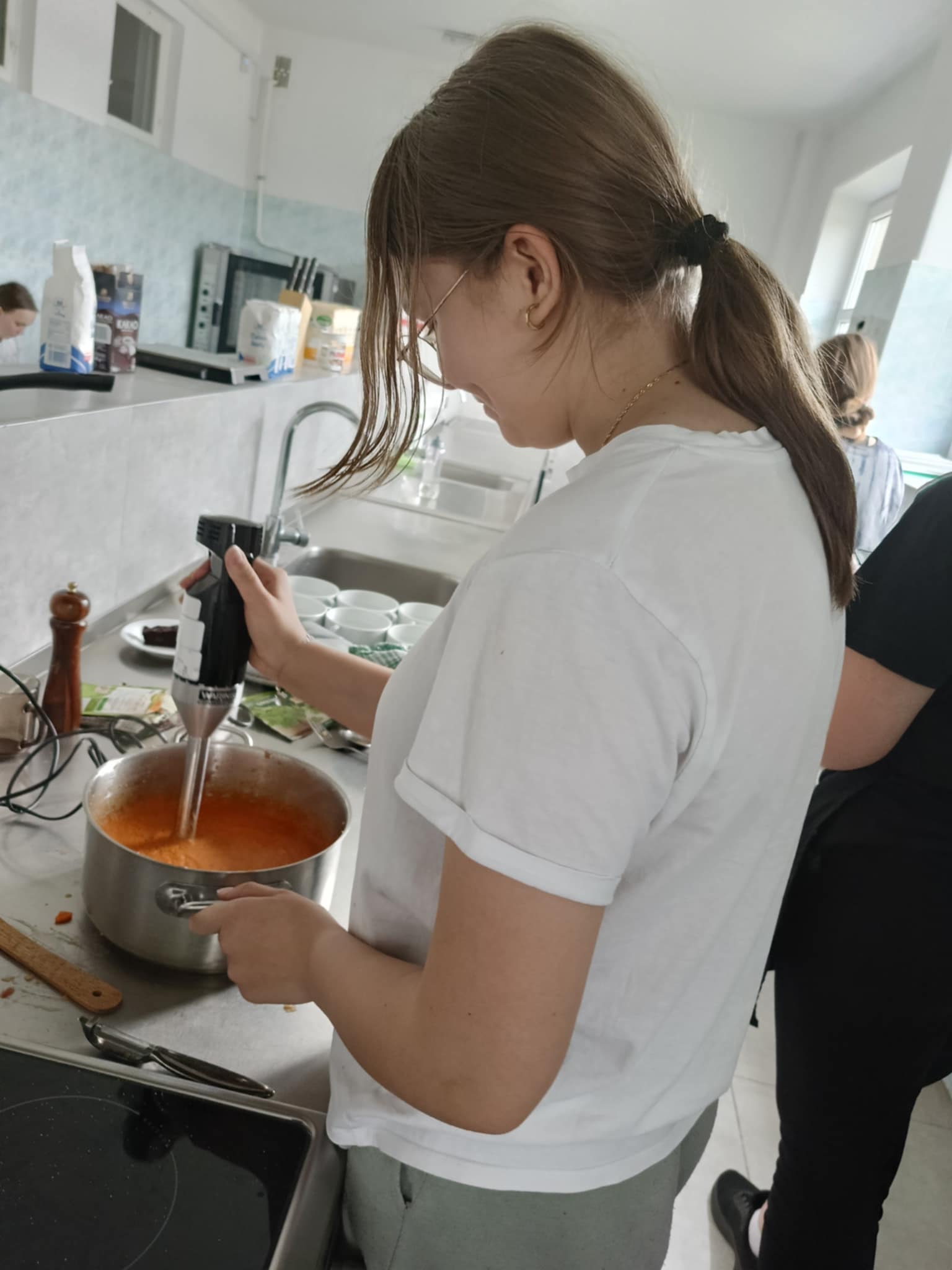 Dzisiejsze gotowanie klasy 1a. Krem z pomidorów z chlebkami własnego wypieku, a na deser Brownie czekoladowe.