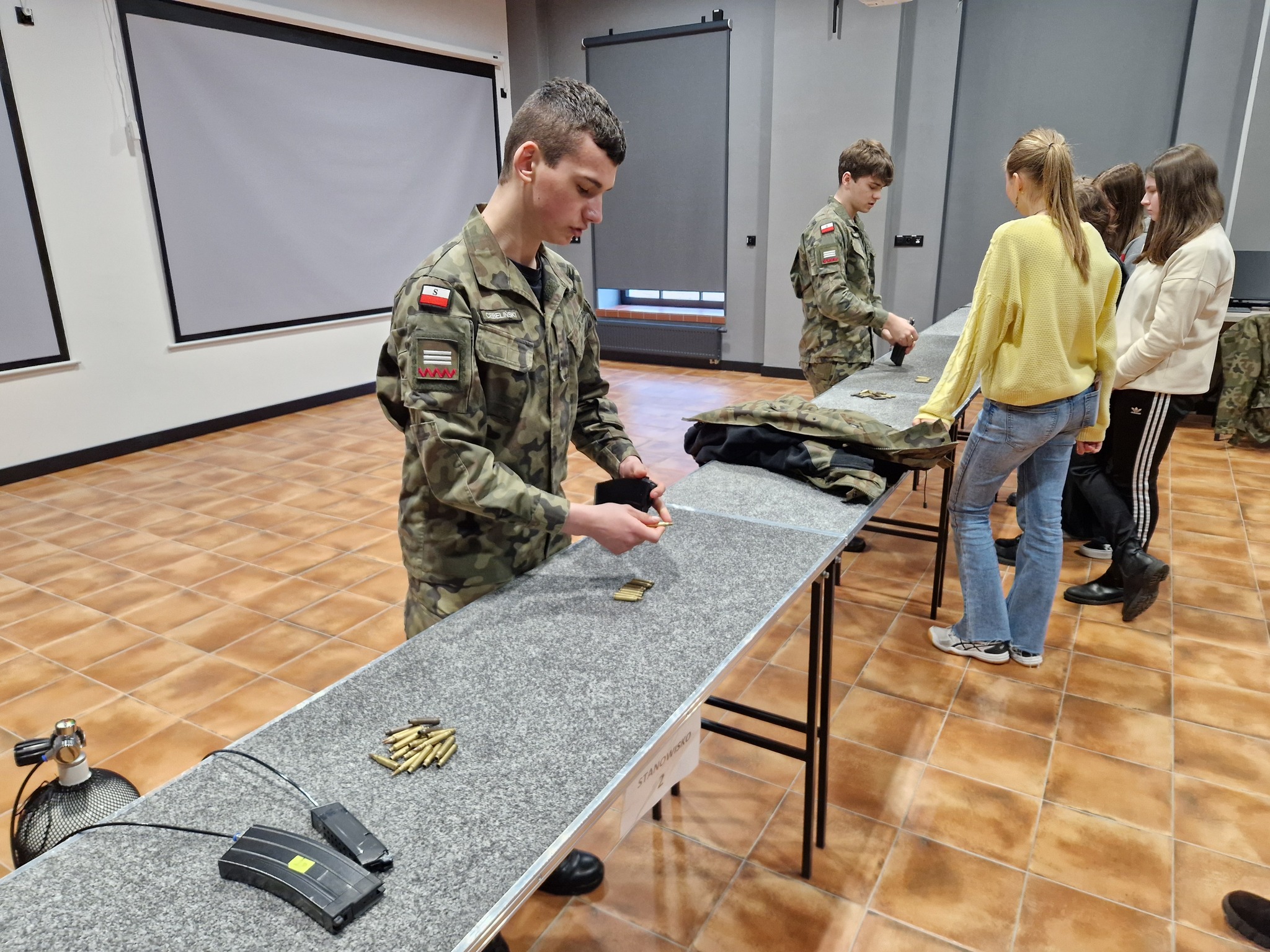 Podstawy strzelania z broni pneumatycznej przeprowadził instruktor p. Michał Naruszewicz. Natomiast ładowanie magazynka nabojami przeprowadzili uczniowie kl. 3w: Bartosz Cebeliński oraz Oliwier Kuryś.