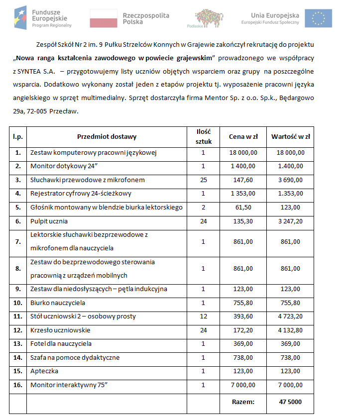 Zespół Szkół Nr 2 im. 9 Pułku Strzelców Konnych w Grajewie zakończył rekrutację do projektu „Nowa ranga kształcenia zawodowego w powiecie grajewskim” prowadzonego we współpracy z SYNTEA S.A. – przygotowujemy listy uczniów objętych wsparciem oraz grupy na poszczególne wsparcia. Dodatkowo wykonany został jeden z etapów projektu tj. wyposażenie pracowni języka angielskiego w sprzęt multimedialny. Sprzęt dostarczyła firma Mentor Sp. z o.o. Sp.k., Będargowo 29a, 72-005 Przecław.